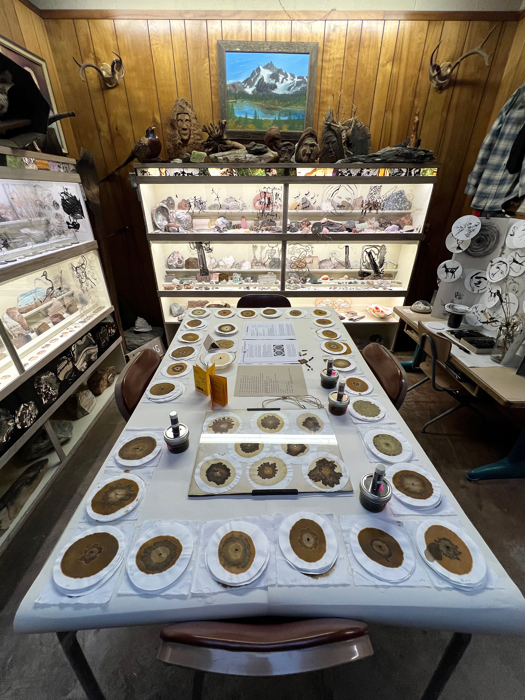 At the center of Redwood Time is a radical, as in root, study and re-envisioning of the monumental Redwood Round adjacent to the Guest House Museum on Fort Bragg’s Main Street. Cut from the ‘largest Redwood tree known to have grown in Mendocino County’, the Round functions as roadside spectacle, as tourist attraction, and as a monument to the timber industry and the settler town that grew around it. If one approaches closely enough to read the timeline pinned to the round’s face: from its rings have been conjured the tale of how this one particular story fits within the context of canonical world history.